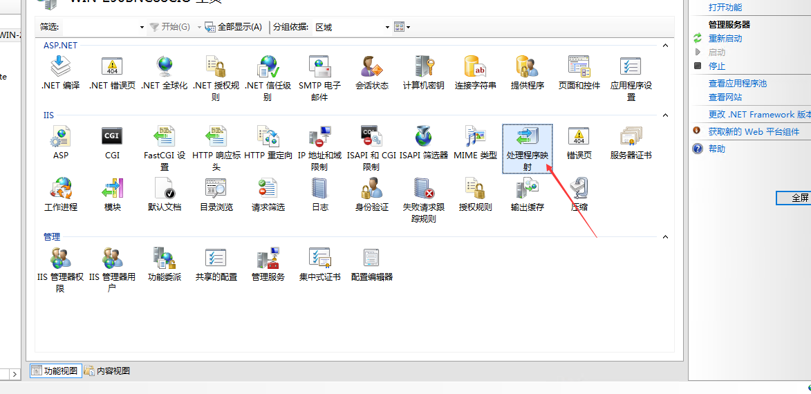 1、在IIS中主界面中,双击 “处理程序映射”,进入 “处理程序映射”管理 界面