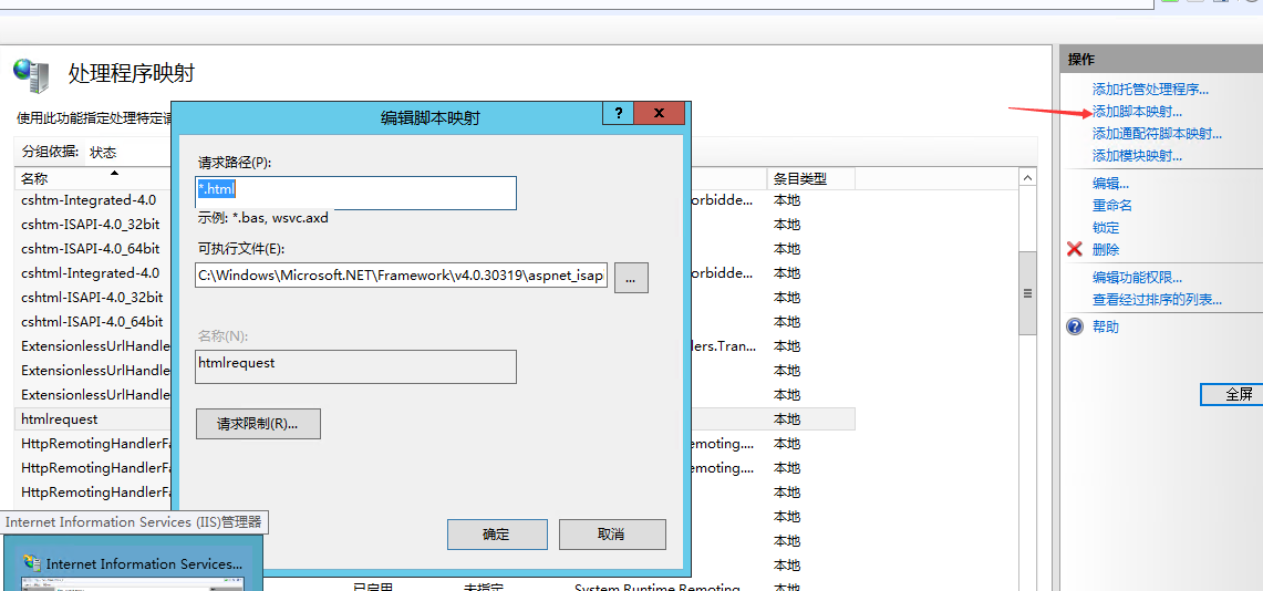 2、在“处理程序映射”界面中,点击 右上边的“添加脚本映射”,在弹出的对话框中