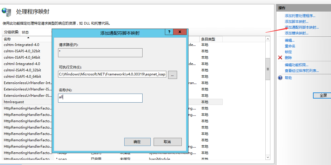3、在“处理程序映射”界面中,点击 右上边的“添加通配符脚本映射”,在弹出的对话框中
