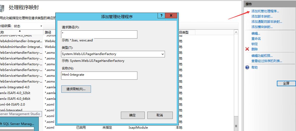 4、在“处理程序映射”界面中,点击 右上边的“添加托管处理程序”,在弹出的对话框中
