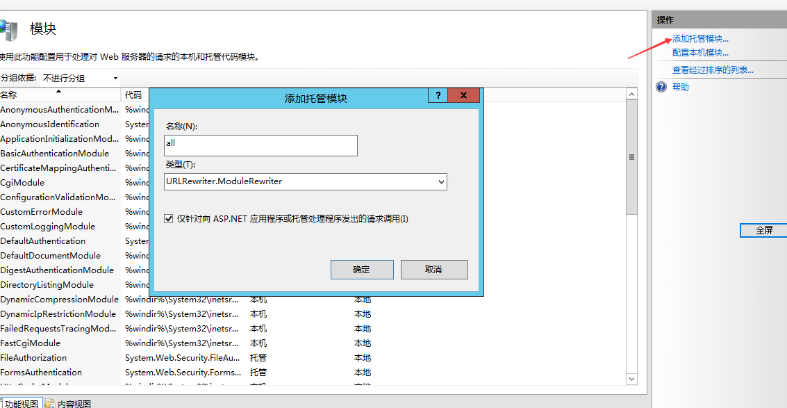 类型:URLRewriter.ModuleRewriter,勾选上下面仅针对asp。net应用程序或者是托管程序发出的请求调用