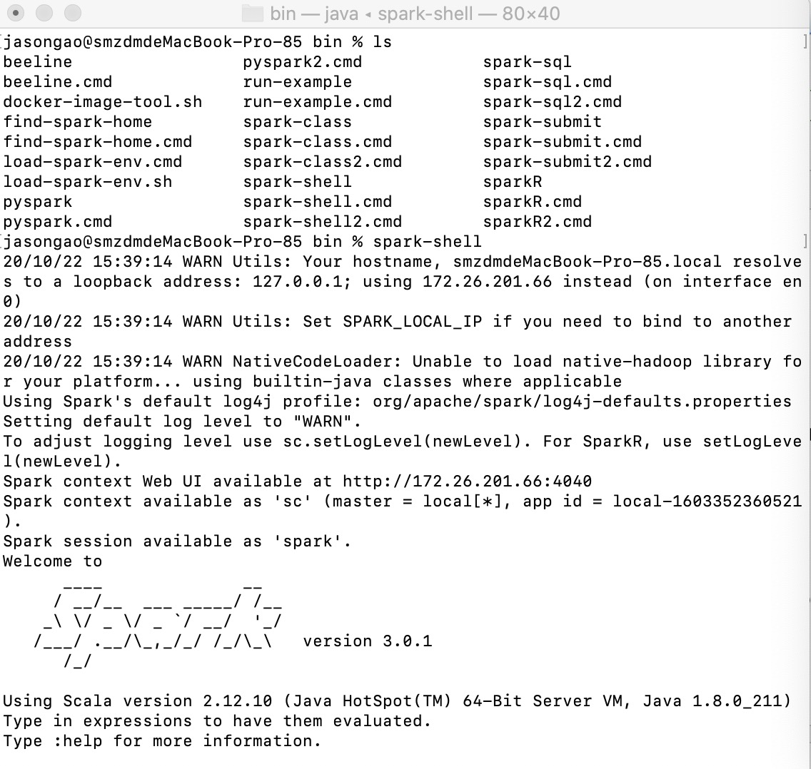 3、进入/usr/local/spark3.0.1/bin,执行 spark-shell ,即可启动Spark控制台界面