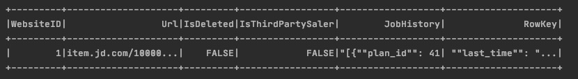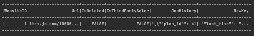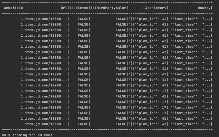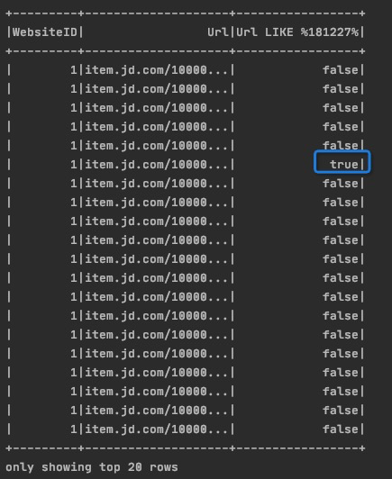 df.registerTempTable('Product') spark.sql("select * from Product where Url ='item.jd.com/100000181227.html'").show()